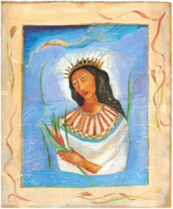 “I am Pharaoh’s daughter,” she agreed, “but I am also Meroe, a woman who will not watch a baby drown.” Meroe did not listen to the women, nor to her father’s command. She leaned forward as far as she could and extended her arms toward the floating cradle. The handmaids were astonished, as it seemed that her arms grew longer and longer until her fingers finally touched the edge of the basket, and she drew it toward her. Meroe gently lifted the basket, placed it on the riverbank, and opened it. There she saw a baby boy, more beautiful than any she had ever seen. The baby began to cry, and Meroe gathered him in her arms and held him close and loved him. “I will call you Moses because in the language of my people, Moses means son. And you are the child I drew out of the water.”